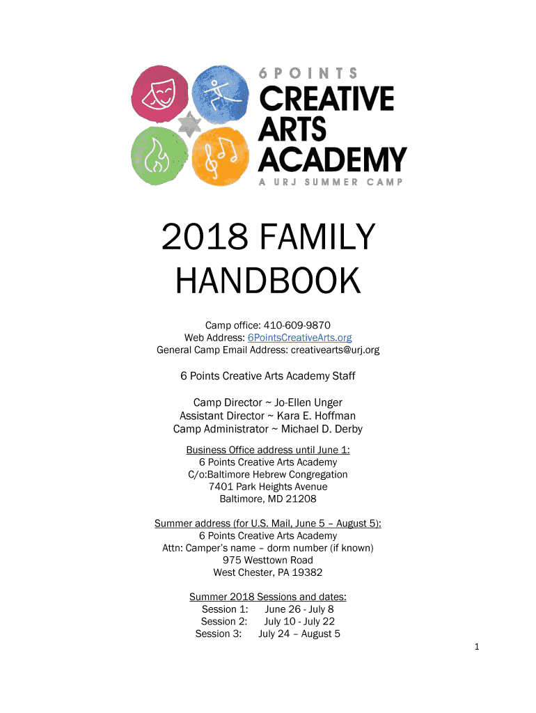 2018 FAMILY HANDBOOK Camp office: 4106099870 Web Address: 6PointsCreativeArts.org General Camp Email Address: creative arts URL.org6 Points Creative Arts Academy Staff Camp Director Jo Ellen Unger