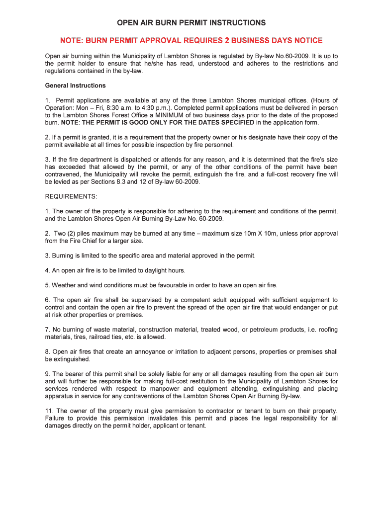 OPEN AIR BURN PERMIT INSTRUCTIONS NOTE: BURN PERMIT APPROVAL REQUIRES 2 BUSINESS DAYS NOTICE Open air burning within the Municipality of Lamb ton Shores is regulated by Bylaw No.602009. It is up to