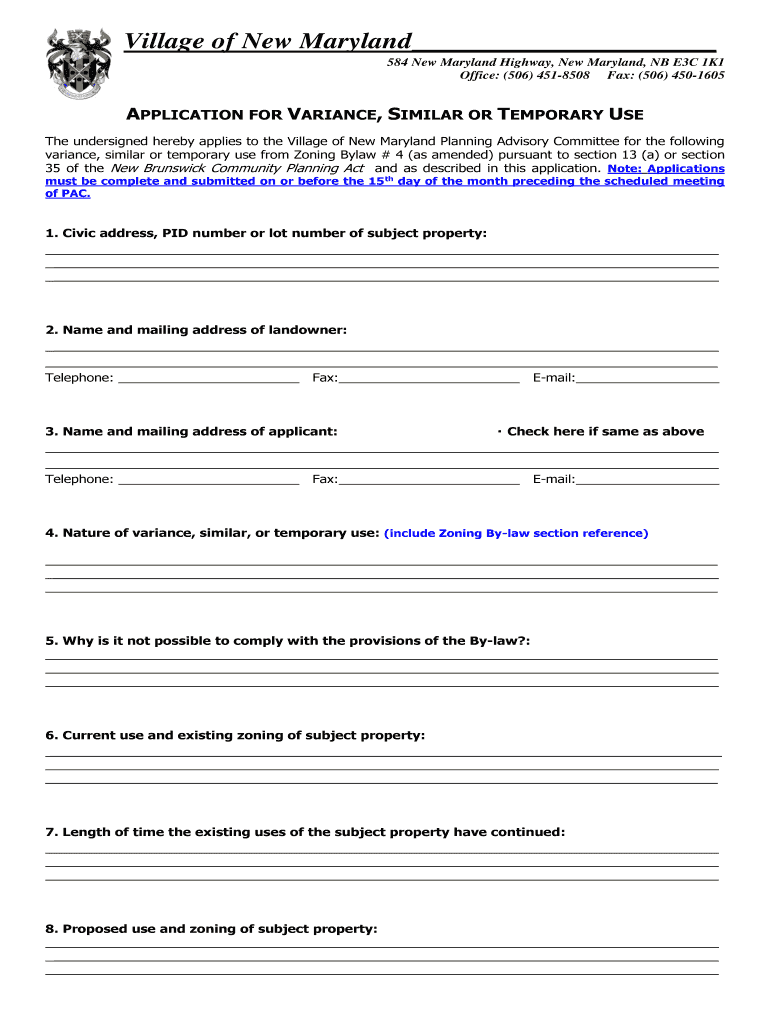 Village of New Maryland 584 New Maryland Highway, New Maryland, NB E3C 1K1 Office: (506) 4518508 Fax: (506) 4501605APPLICATION FOR VARIANCE, SIMILAR OR TEMPORARY USE The undersigned hereby applies