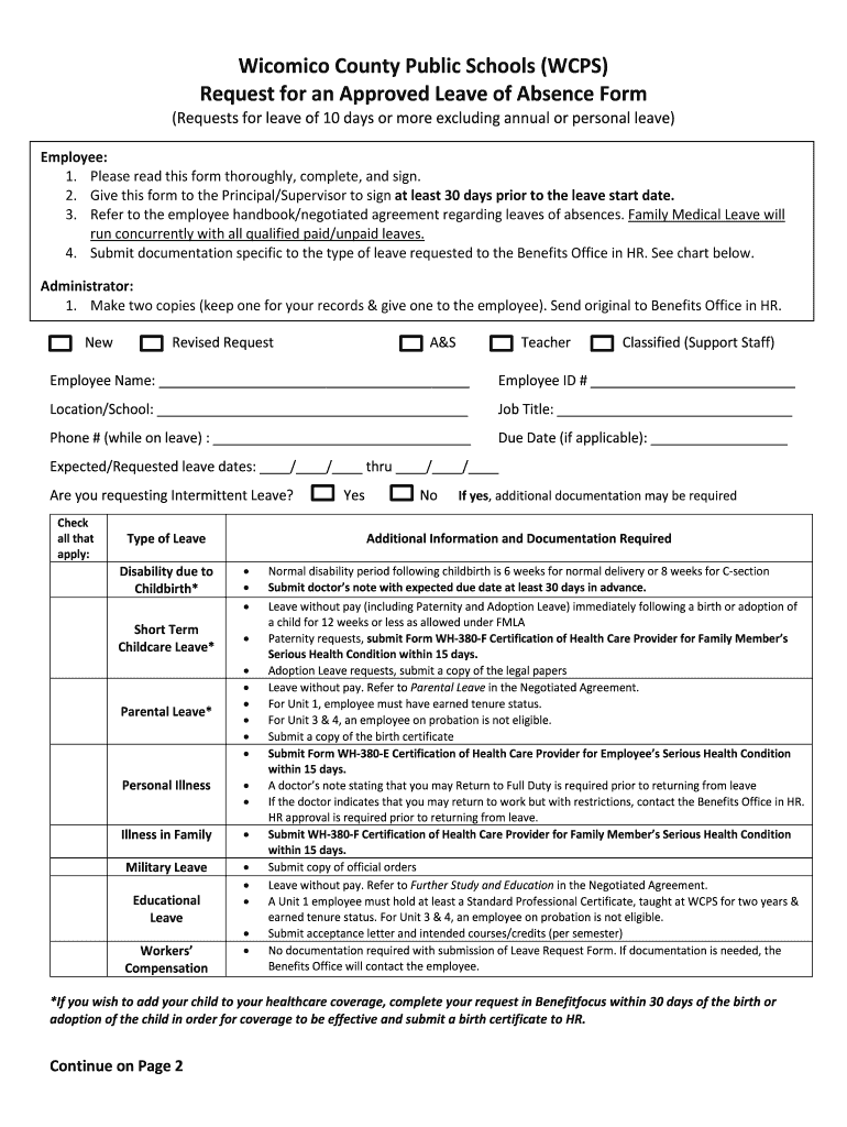 Request for an Approved Leave of Absence Form(Requests for leave of 10 days or more excluding annual or personal leave)