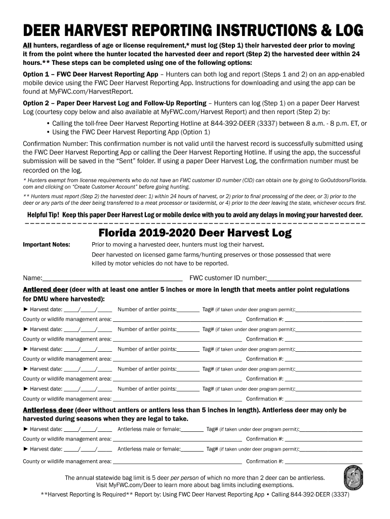 DEER HARVEST REPORTING INSTRUCTIONS & LOG All hunters, regardless of age or license requirement, * must log (Step 1) their harvested deer prior to moving it from the point where the hunter located