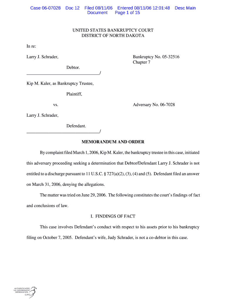 Case 0607028Doc 12Filed 08/11/06 Entered 08/11/06 12:01:48 Document Page 1 of 15Desc Maintained STATES BANKRUPTCY COURT DISTRICT OF NORTH DAKOTA In re: Larry J. Schrader, Bankruptcy No. 0532516 Chapter