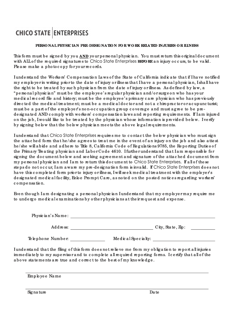 Employees are required to file personal physician pre-designation if they want to choose their own doctor for work-related injuries.