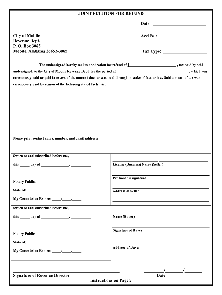 JOINT PETITION FOR REFUND Date: City of Mobile Revenue Dept. P. O. Box 3065 Mobile, Alabama 366523065Acct No: Tax Type: The undersigned hereby makes application for refund of $, tax paid by said undersigned,