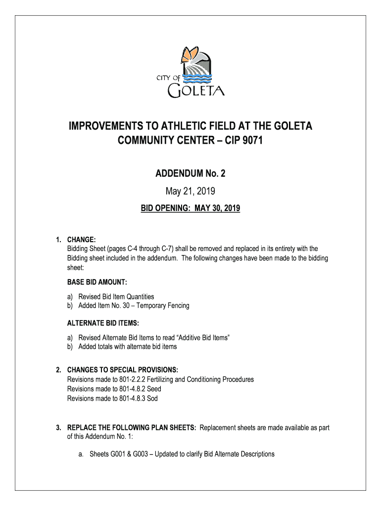 IMPROVEMENTS TO ATHLETIC FIELD AT THE GOLETA COMMUNITY CENTER CIP 9071 ADDENDUM No. 2 May 21, 2019, BID OPENING: MAY 30, 2019 1. CHANGE: Bidding Sheet (pages C4 through C7) shall be removed and replaced