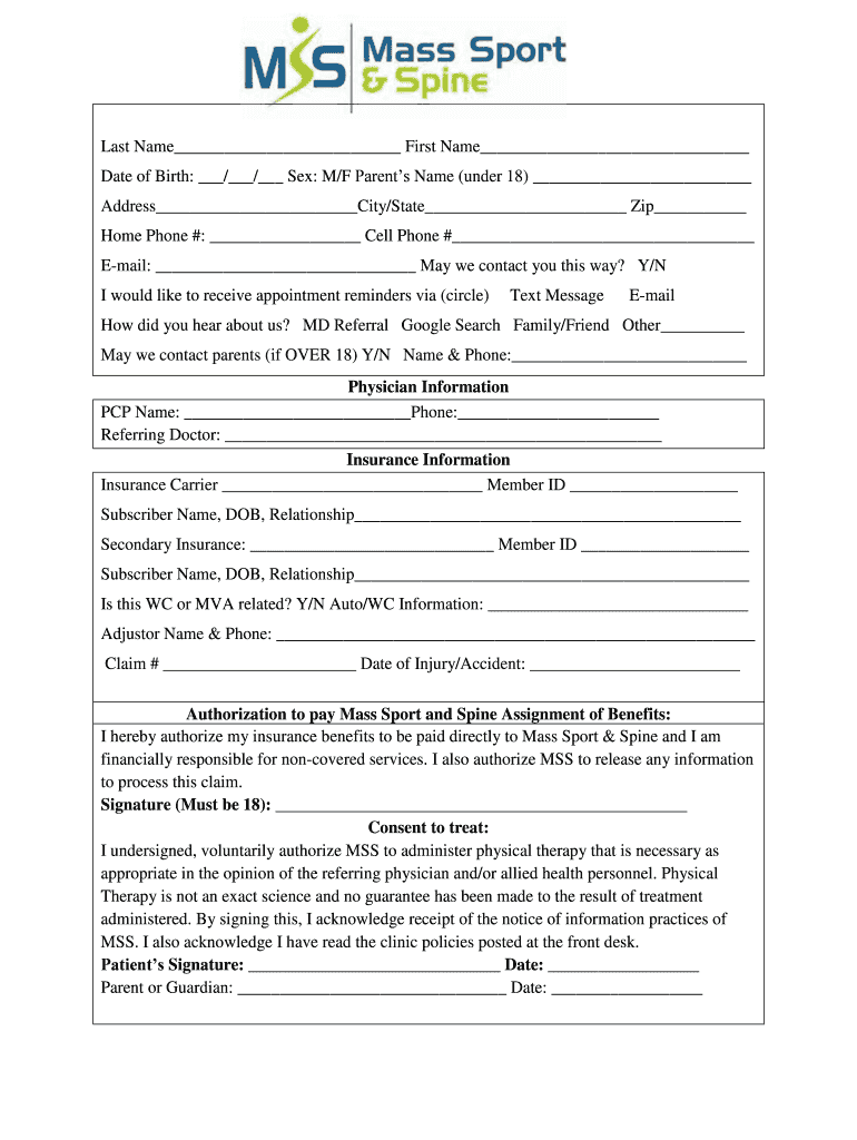 Last Name First Name Date of Birth: / / Sex: M/F Parents Name (under 18) Address City/State Zip Home Phone #: Cell Phone # Email: May we contact you this way? Y/N I would like to receive appointment