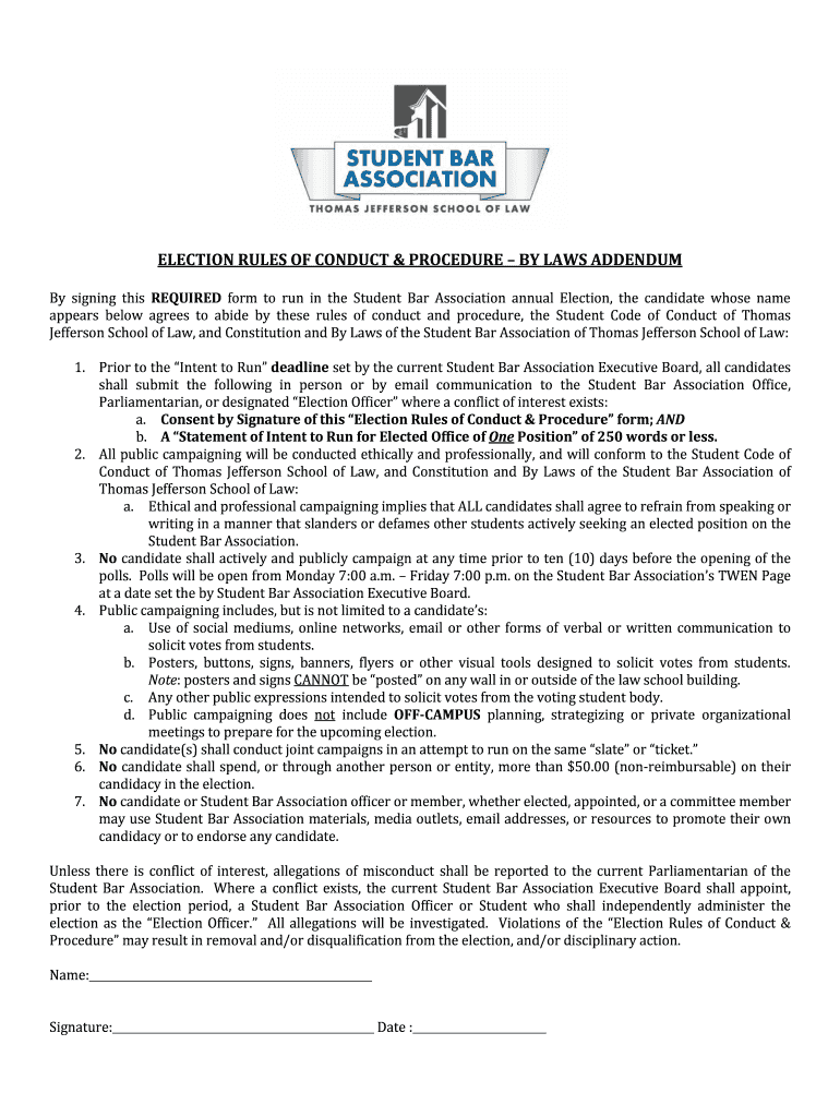ELECTION RULES OF CONDUCT & PROCEDURE BY LAWS ADDENDUM By signing this REQUIRED form to run in the Student Bar Association annual Election, the candidate whose name appears below agrees to abide by