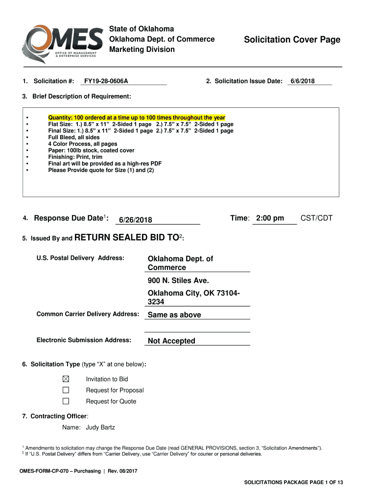 State of Oklahoma Dept. of Commerce Marketing Division1. Solicitation #:FY19280606ASolicitation Cover Page2. Solicitation Issue Date:6/6/20183. Brief Description of Requirement: 4. Quantity: 100 ordered