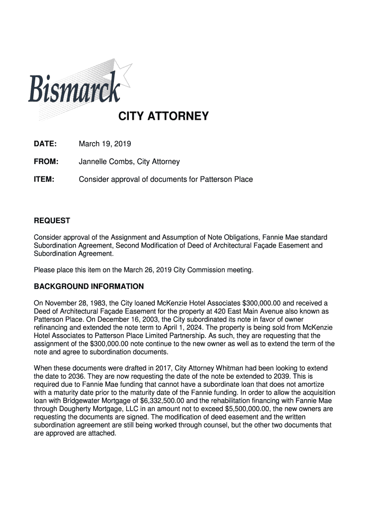 DATE:March 19, 2019FROM:Janelle Combs, City AttorneyITEM:Consider approval of documents for Patterson PlaceREQUEST