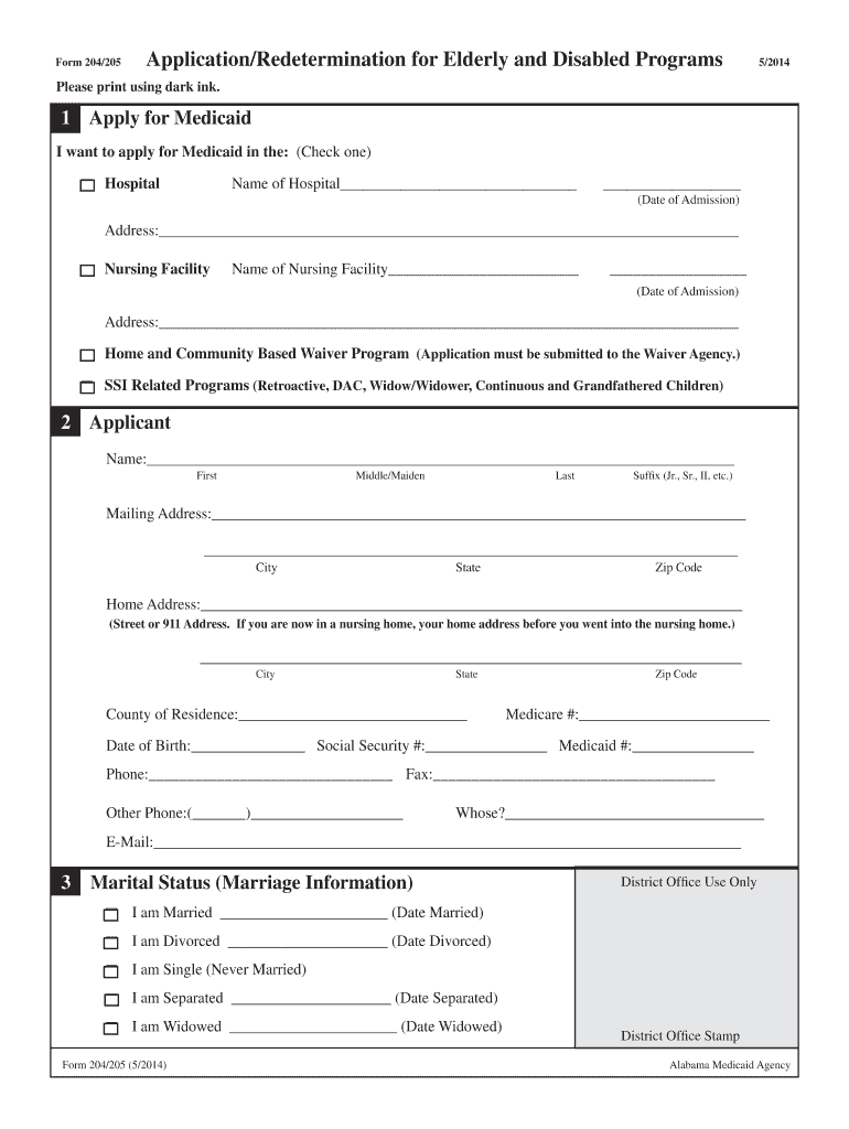 Alabama Medicaid Agency Application/Redetermination for Elderly and Disabled Programs Instructions: Read this application carefully and follow all instructions given throughout the form. Answer each
