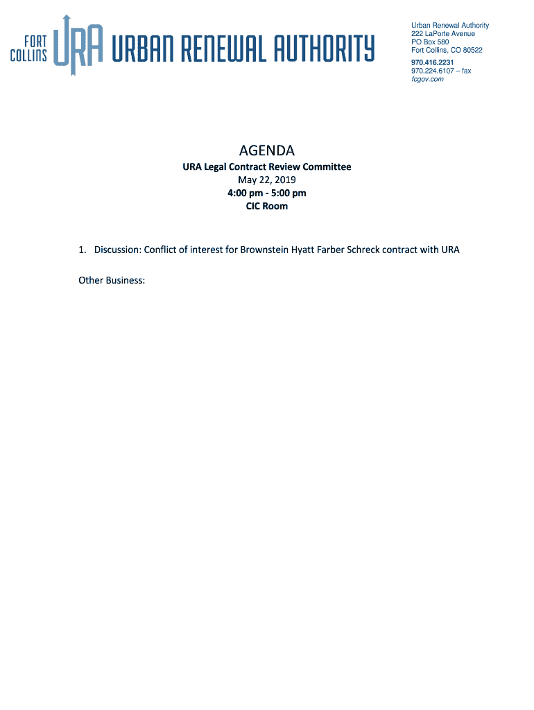 Urban Renewal Authority 222 Lahore Avenue PO Box 580 Fort Collins, CO 80522 970.416.2231 970.224.6107 fax gov.comAGENDAURA Legal Contract Review Committee May 22, 2019 4:00 pm 5:00 pm CIC Room1. Discussion: