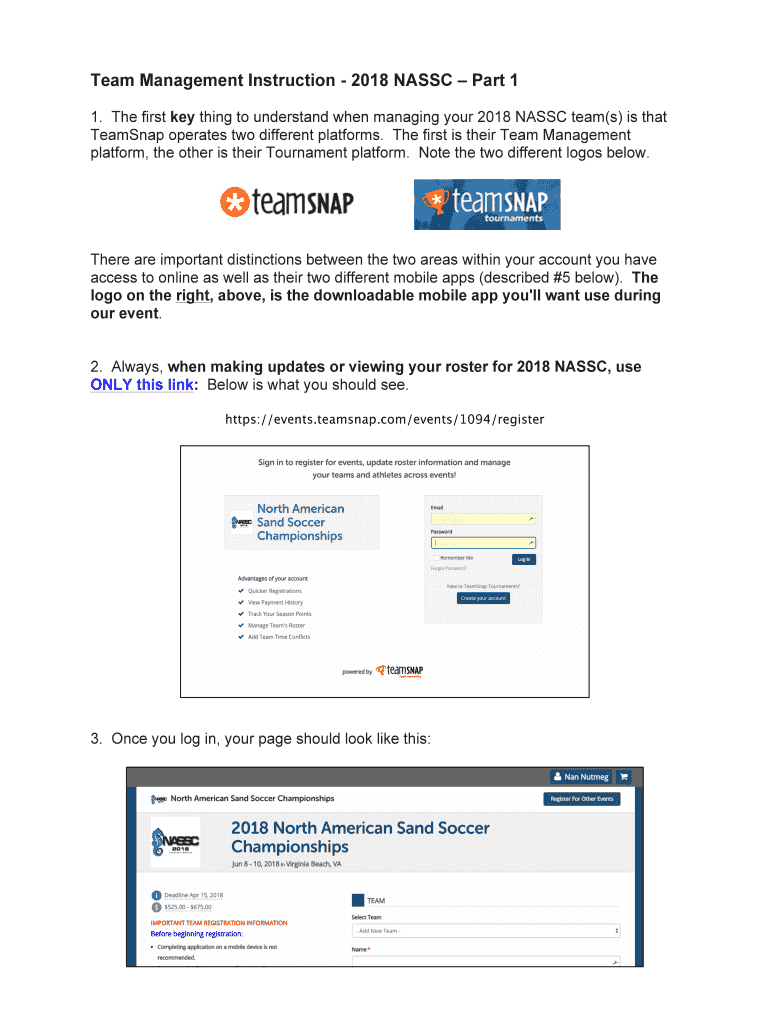 Team Management Instruction 2018 NAS SC Part 1 1. The first key thing to understand when managing your 2018 NAS SC team(s) is that Team Snap operates two different platforms. The first is their Team