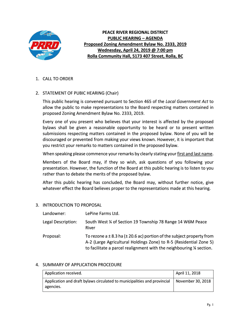 PEACE RIVER REGIONAL DISTRICT PUBLIC HEARING AGENDA Proposed Zoning Amendment Bylaw No. 2333, 2019 Wednesday, April 24, 2019 7:00 pm Roll Community Hall, 5173 407 Street, Roll, BC1. CALL TO ORDER