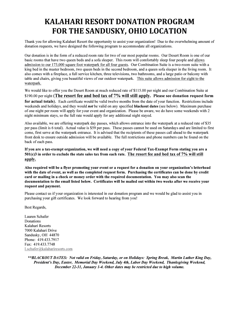 KALAHARI×RESORT×DONATION×PROGRAMMER×THE×SANDUSKY, ×OHIO×LOCATIONThank you for allowing Kalahari Resort the opportunity to assist your organization! Due to the overwhelming amount of