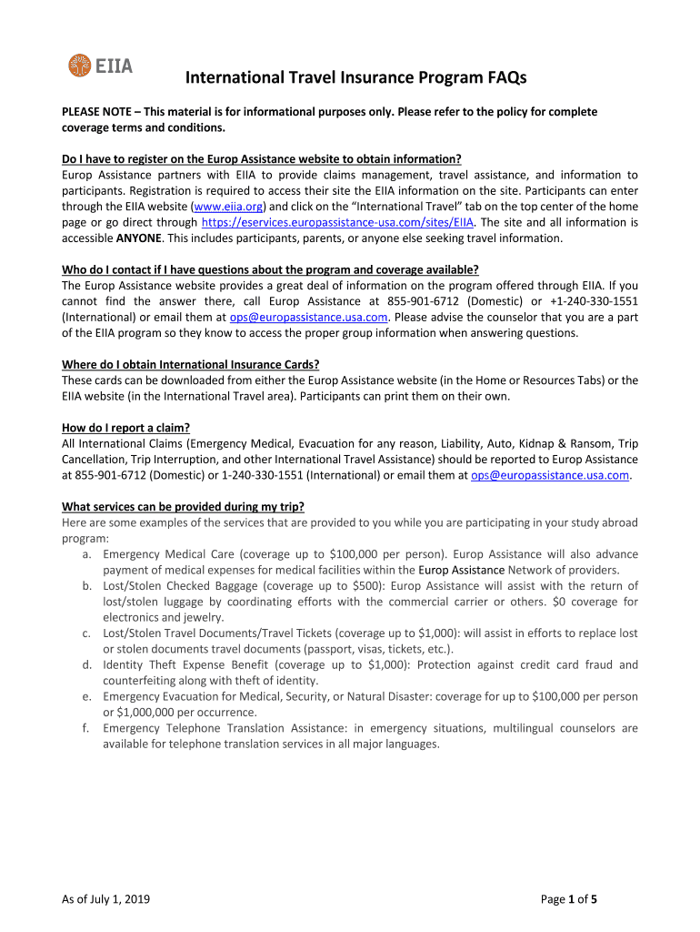 International Travel Insurance Program FAQs PLEASE NOTE This material is for informational purposes only. Please refer to the policy for complete coverage terms and conditions. Do I have to register