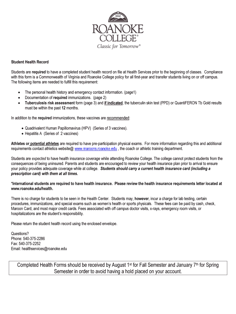 Student Health Record Students are required to have a completed student health record on file at Health Services prior to the beginning of classes. Compliance with this form is a Commonwealth of Virginia