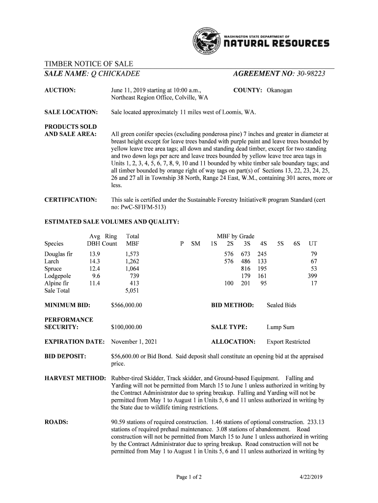 TIMBER NOTICE OF SALE NAME: Q CHICKADEEAGREEMENT NO: 3098223AUCTION:June 11, 2019, starting at 10:00 a.m.,