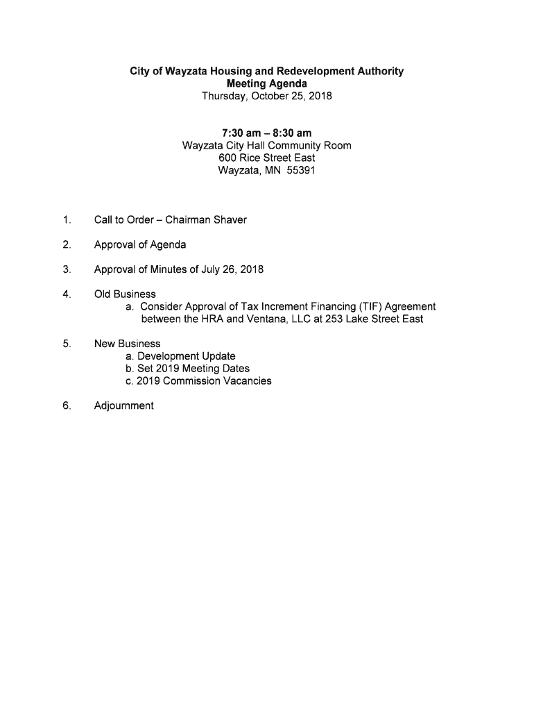 City of Wayzata Housing and Redevelopment Authority Meeting Agenda Thursday, October 25, 2018 7:30 am 8:30 am Wayzata City Hall Community Room 600 Rice Street East Wayzata, MN 553911. Call to Order