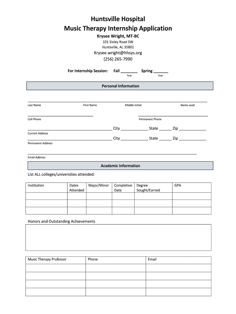 Huntsville Hospital Music Therapy Internship Application Kresge Wright, MBC 101 Silva Road SW Huntsville, AL 35801Krysee. Wright hosts.org (256) 2657990 For Internship Session:Fall Spring YearYearPersonal