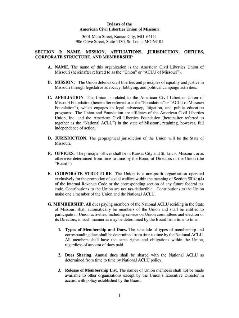 Get the free Bylaws of the American Civil Liberties Union of Missouri 3601 ...