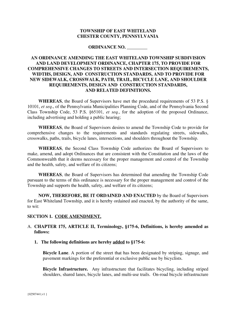 TOWNSHIP OF EAST RHINELAND CHESTER COUNTY, PENNSYLVANIA ORDINANCE NO. AN ORDINANCE AMENDING THE EAST RHINELAND TOWNSHIP SUBDIVISION AND LAND DEVELOPMENT ORDINANCE, CHAPTER 175, TO PROVIDE FOR COMPREHENSIVE