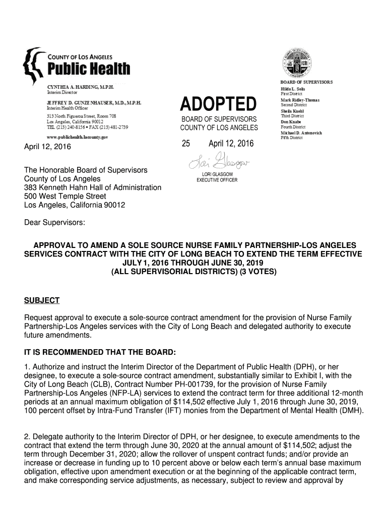 Get the free APPROVAL TO AMEND A SOLE SOURCE NURSE FAMILY PARTNERSHIP-LOS ANGELES - file lacounty