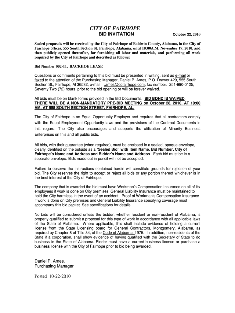 BID INVITATION October 22, 2010Sealed proposals will be received by the City of Fairhope of Baldwin County, Alabama, in the City of
