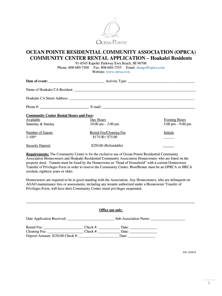OCEAN POINT RESIDENTIAL COMMUNITY ASSOCIATION (OPCA) COMMUNITY CENTER RENTAL APPLICATION Oakley Residents 916545 Cupola Parkway Era Beach, HI 96706 Phone: 8086897500 Fax: 8086897555 Email: design