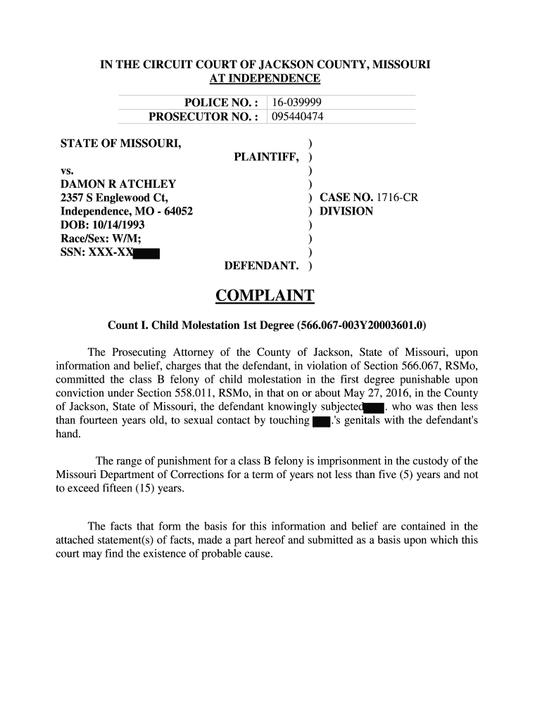 IN THE CIRCUIT COURT OF JACKSON COUNTY, MISSOURI AT INDEPENDENCE POLICE NO. PROSECUTOR NO. STATE OF MISSOURI, vs. DAMON R ASHLEY 2357 S Englewood Ct, Independence, MO 64052 DOB: 10/14/1993 Race/Sex: