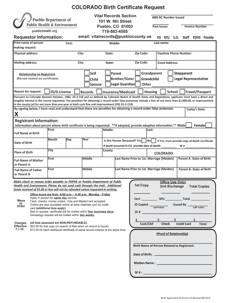 How to fill out CO Birth Certificate Request - Pueblo County?