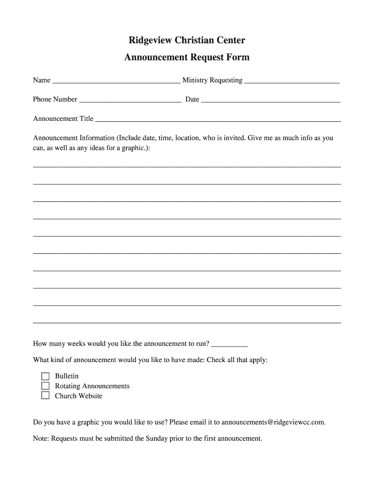 Ridge view Christian Center Announcement Request Form Name Ministry Requesting Phone Number Date Announcement Title Announcement Information (Include date, time, location, who is invited. Give me