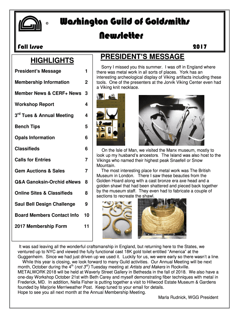 Washington Guild of Goldsmiths NewsletterFall Issue2017PRESIDENTS MESSAGEHIGHLIGHTS Presidents Message1Membership Information2Sorry I missed you this summer. I was off in England where there was metal