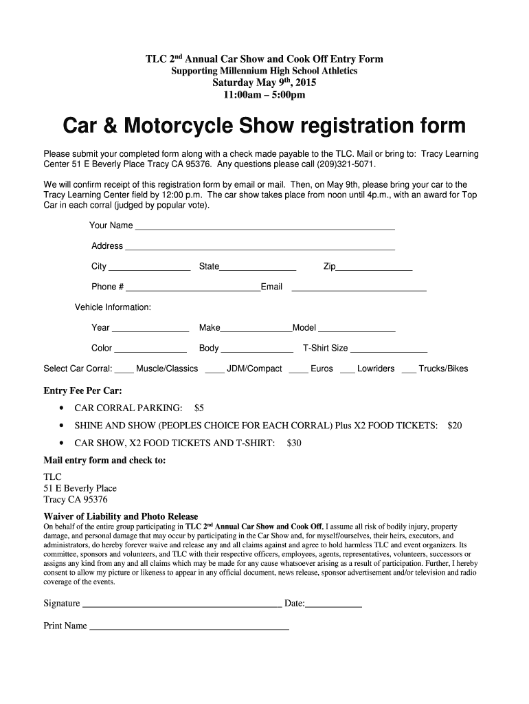 TLC 2nd Annual Car Show and Cook Off Entry Form Supporting Millennium High School Athletics Saturday, May 9th, 2015 11:00am 5:00pmCar & Motorcycle Show registration form Please submit your completed