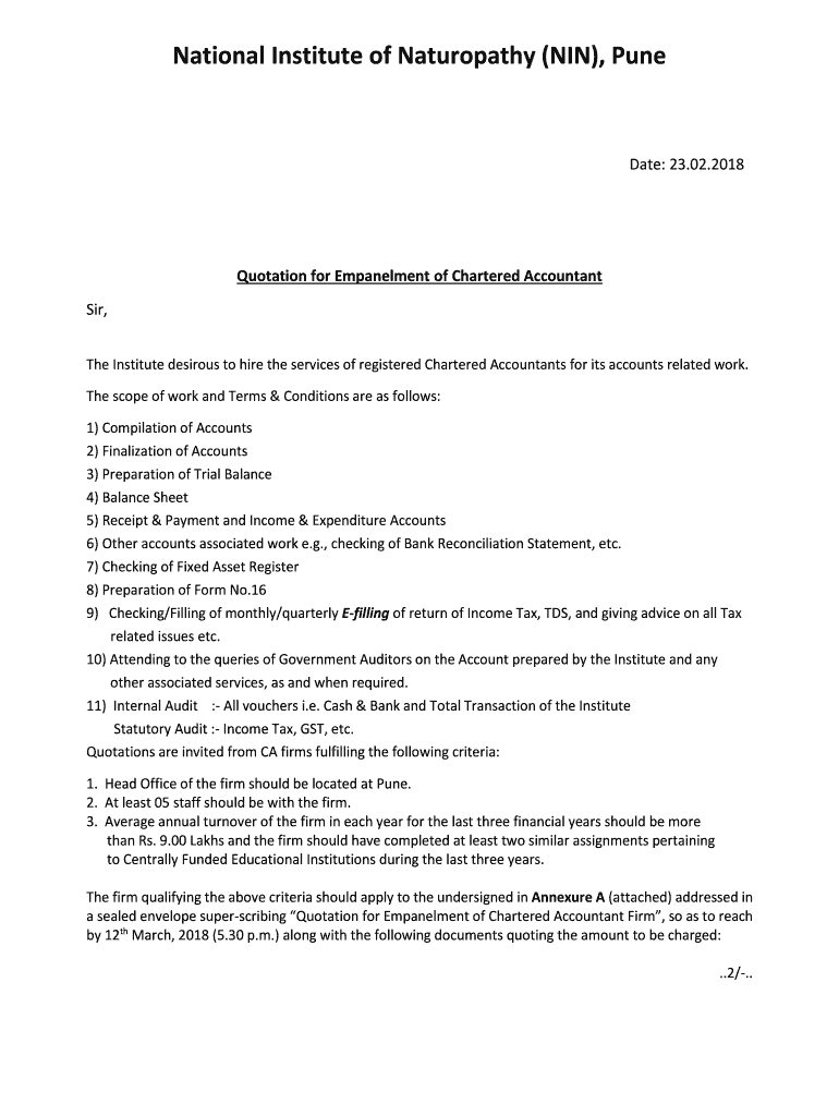 National Institute of Naturopathy (NIN), Predate: 23.02.2018Quotation for Embankment of Chartered Accountant Sir, The Institute desirous to hire the services of registered Chartered Accountants for