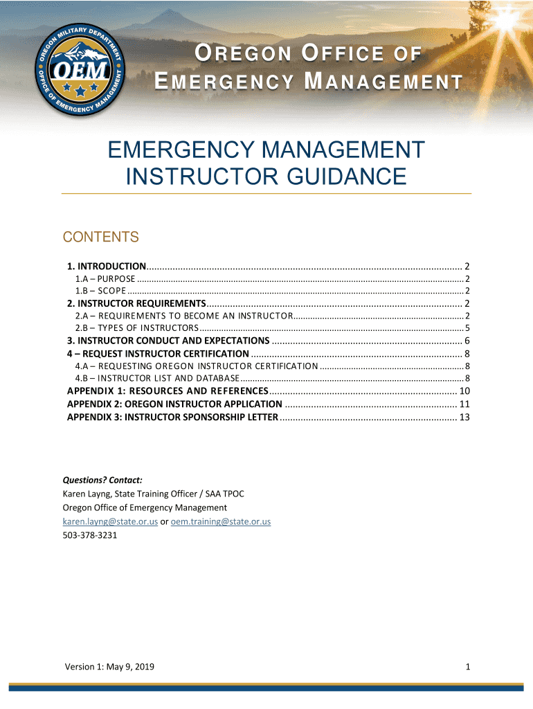 OREGON OFFICE OF EMERGENCY MANAGEMENT INSTRUCTOR GUIDANCE CONTENTS 1. INTRODUCTION.........................................................................................................................