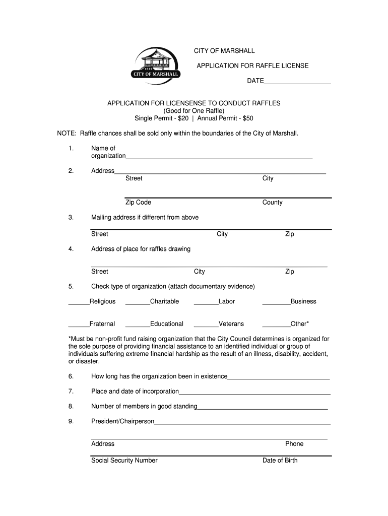 CITY OF MARSHALL APPLICATION FOR RAFFLE LICENSE DATE APPLICATION FOR LICENSES TO CONDUCT RAFFLES (Good for One Raffle) Single Permit $20 Annual Permit $50 NOTE: Raffle chances shall be sold only within