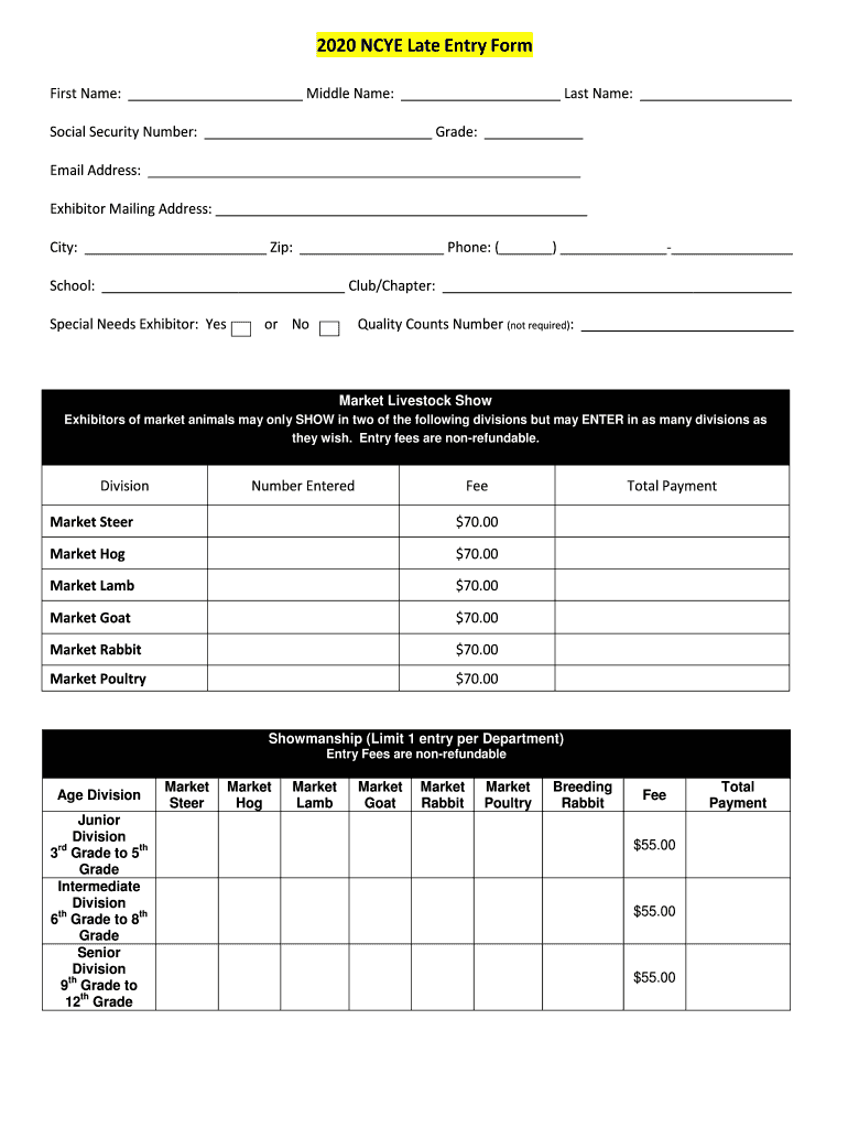 2020 NCE Late Entry Form First Name: Middle Name: Last Name: Social Security Number: Grade: Email Address: Exhibitor Mailing Address: City: Zip: Phone: () School: Club/Chapter: Special Needs Exhibitor:
