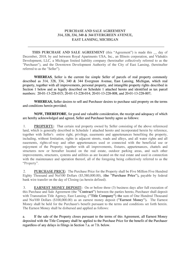 PURCHASE AND SALE AGREEMENT 314, 328, 334, 340 & 344 EVERGREEN AVENUE, EAST LANSING, MICHIGAN THIS PURCHASE AND SALE AGREEMENT (this Agreement) is made this day of December 2018, by and between Royal