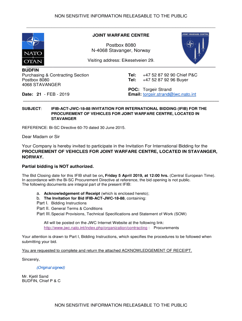 NON-SENSITIVE INFORMATION RELEASABLE TO THE PUBLIC JOINT WARFARE CENTREPostbox 8080 N4068 Stranger, Norway Visiting address: Eikesetveien 29. BUD FIN Tel: +47 52 87 92 90 Chief P&C Purchasing & Contracting