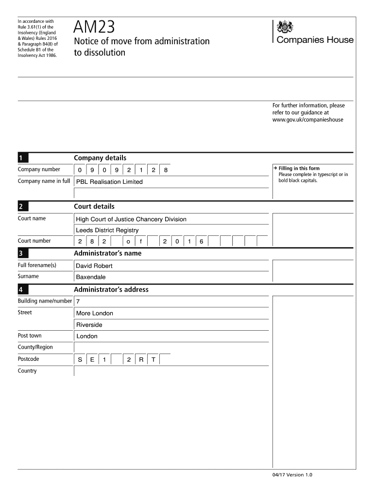 In accordance with Rule 3.61(1) of the Insolvency (England & Wales) Rules 2016 & Paragraph 84(8) of Schedule B1 of the Insolvency Act 1986.AM23Notice of move from administration to dissolution further