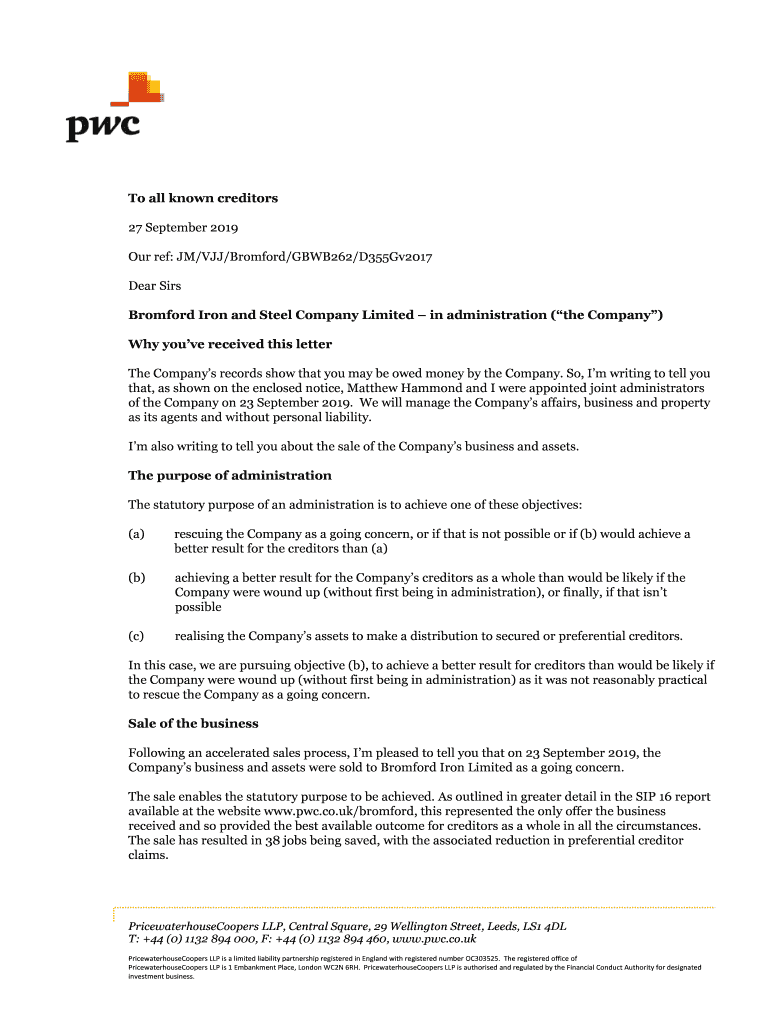 To all known creditors 27 September 2019 Our ref: JM/AJJ/Bradford/GBWB262/D355Gv2017 Dear Sirs Bradford Iron and Steel Company Limited in administration (the Company) Why you've received this letter