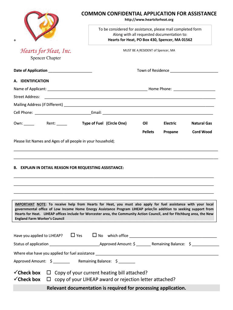 COMMON CONFIDENTIAL APPLICATION FOR ASSISTANCE http://www.heartsforheat.orgTo be considered for assistance, please mail completed form Along with all requested documentation to: Hearts for Heat, PO