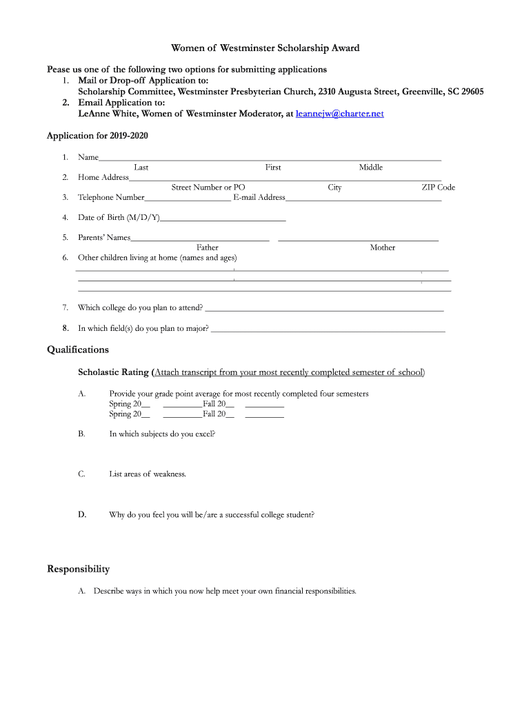 Women of Westminster Scholarship Award Please us one of the following two options for submitting applications 1. Mail or Drop-off Application to: Scholarship Committee, Westminster Presbyterian Church,