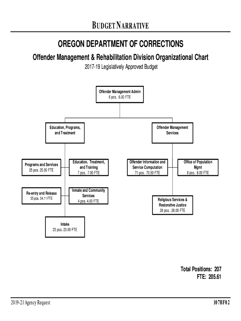 BUDGET NARRATIVE OREGON DEPARTMENT OF CORRECTIONS Offender Management & Rehabilitation Division Organizational Chart 201719 Legislatively Approved BudgetOffender Management Admin 6 POS. 6.00 Reeducation,