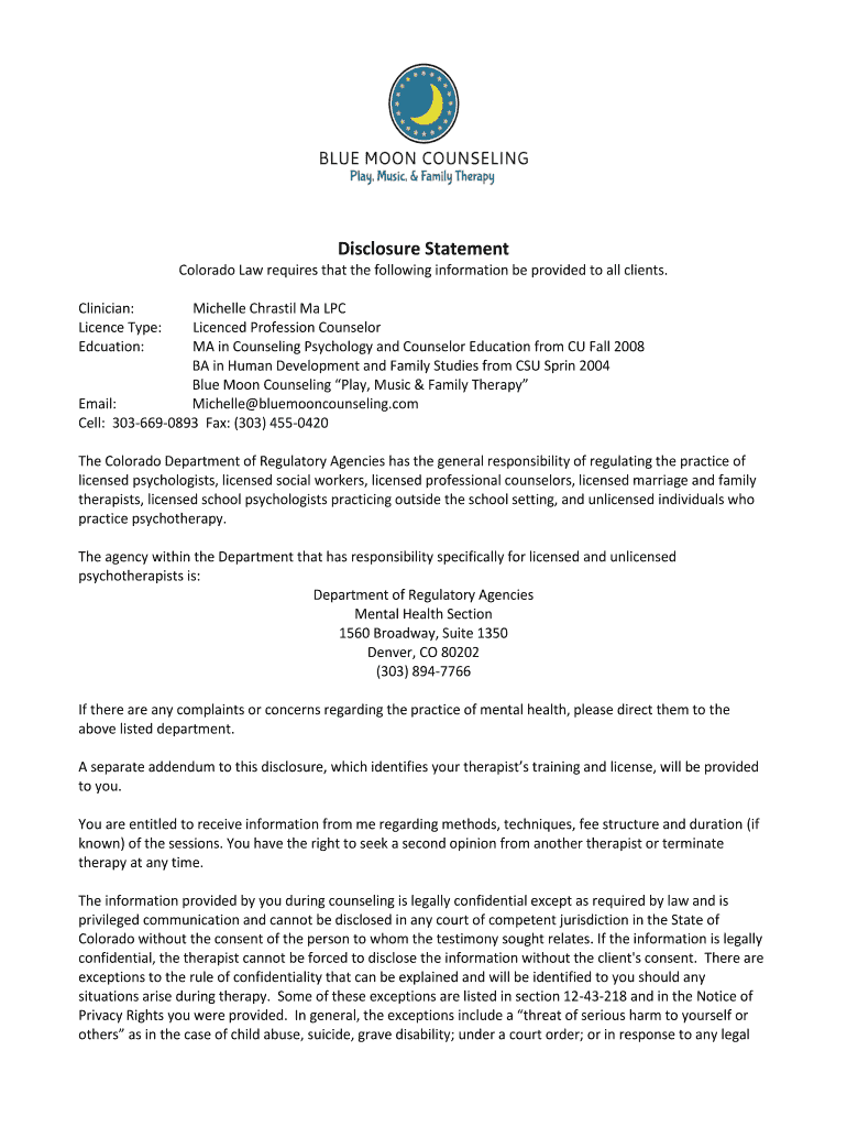Get the free Disclosure Statement - Blue Moon Counseling