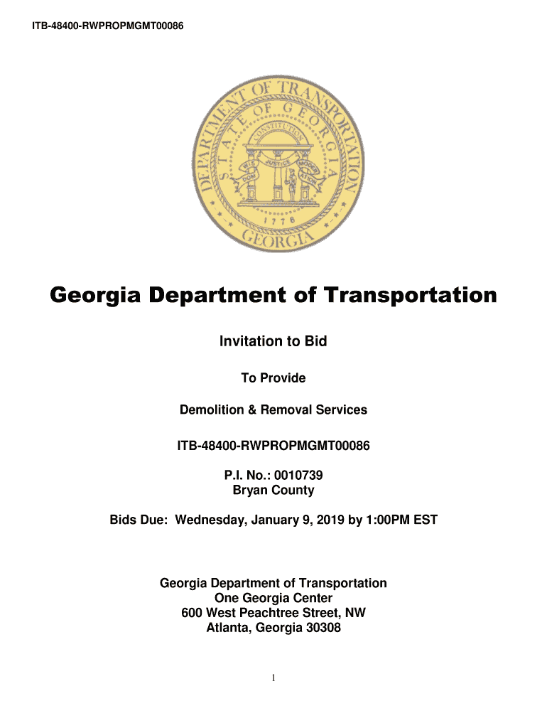 ITB48400RWPROPMGMT00086Georgia Department of Transportation Invitation to Bid To Provide Demolition & Removal Services ITB48400RWPROPMGMT00086 P.I. No.: 0010739 Bryan County Bids Due: Wednesday, January