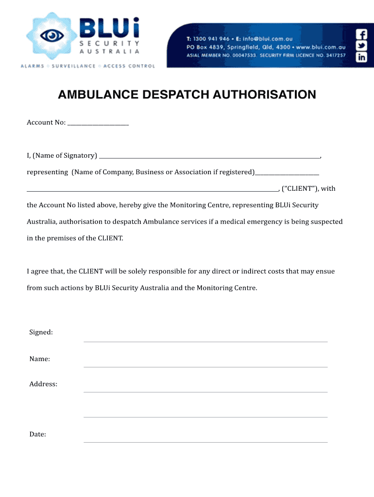AMBULANCE DESPATCH Authorization Account No: I, (NameofSignatory), representing(NameofCompany, BusinessorAssociationifregistered), (CLIENT), with theAccountNolistedabove, herebygivetheMonitoringCentre,