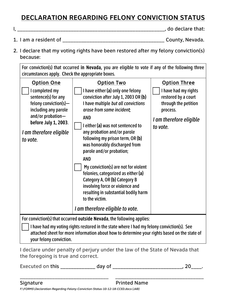 DECLARATION REGARDING FELONY CONVICTION STATUS I, do declare that: 1. I am a resident of County, Nevada. 2. I declare that my voting rights have been restored after my felony conviction(s) because: