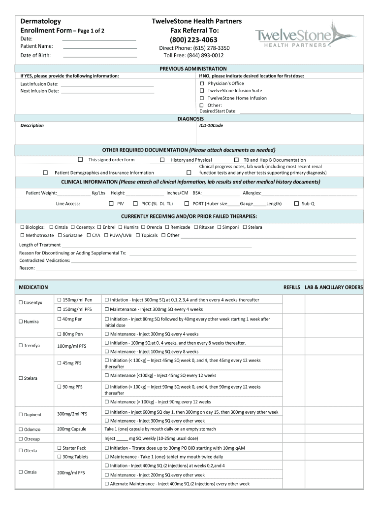 Dermatology Enrollment Form Page 1 of 2TwelveStone Health Partners Fax Referral To: (800) 2234063Date: Patient Name:Direct Phone: (615) 2783350 Toll Free: (844) 8930012Date of Birth:PREVIOUS Administration