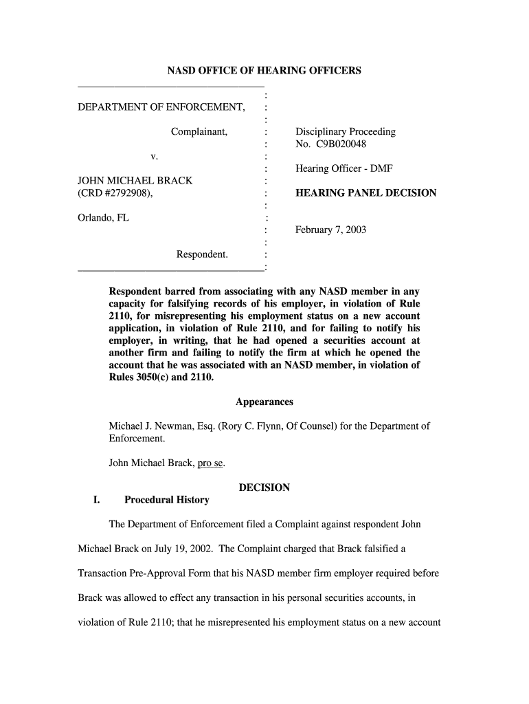 NASA OFFICE OF HEARING OFFICERS : DEPARTMENT OF ENFORCEMENT, : : Complainant, : Disciplinary Proceeding : No. C9B020048 v. : : Hearing Officer DMF JOHN MICHAEL BACK : (CRD #2792908), : HEARING PANEL